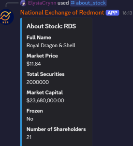 2. Royal Dragon and Shell was a publicly-traded security from August 11th, 2025, to January 11th, 2026, on the National Exchange of Redmont with 2,000,000 shares issued. (P-003, P-004, P-005)