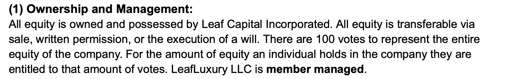8. LeafLuxury LLC is a member-managed LLC incorporated Limited Liability Company under the Legal Entity Act (P-001).
