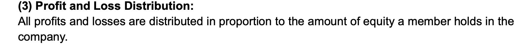 10. The formation document for LeafLuxury LLC on file with the Department of Commerce states, "All profits and losses are distributed in proportion to the amount of equity a member holds in the company." (P-002)