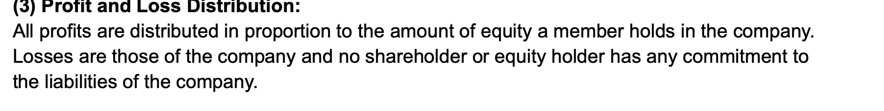 Per the formation document of LeafLuxury LLC (P-002), losses are distributed in proportion of the amount of equity a member holds in the company. RiggoSoft, being the sole member of the company, holds 100% equity in the company, meaning he is responsible for 100% of the loses suffered from this court case. RiggoSoft voluntarily assumed liability for all debts and obligations of LeafLuxury LLC by becoming a member LeafLuxury LLC, in compliance with its formation document.