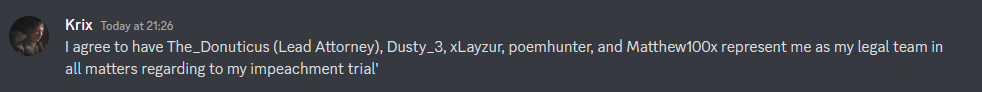 Krix (‘The Dream Team’ Representing: The_Donuticus [Lead Attorney], Dusty_3, xLayzur, poemhunter, and Matthew100x)