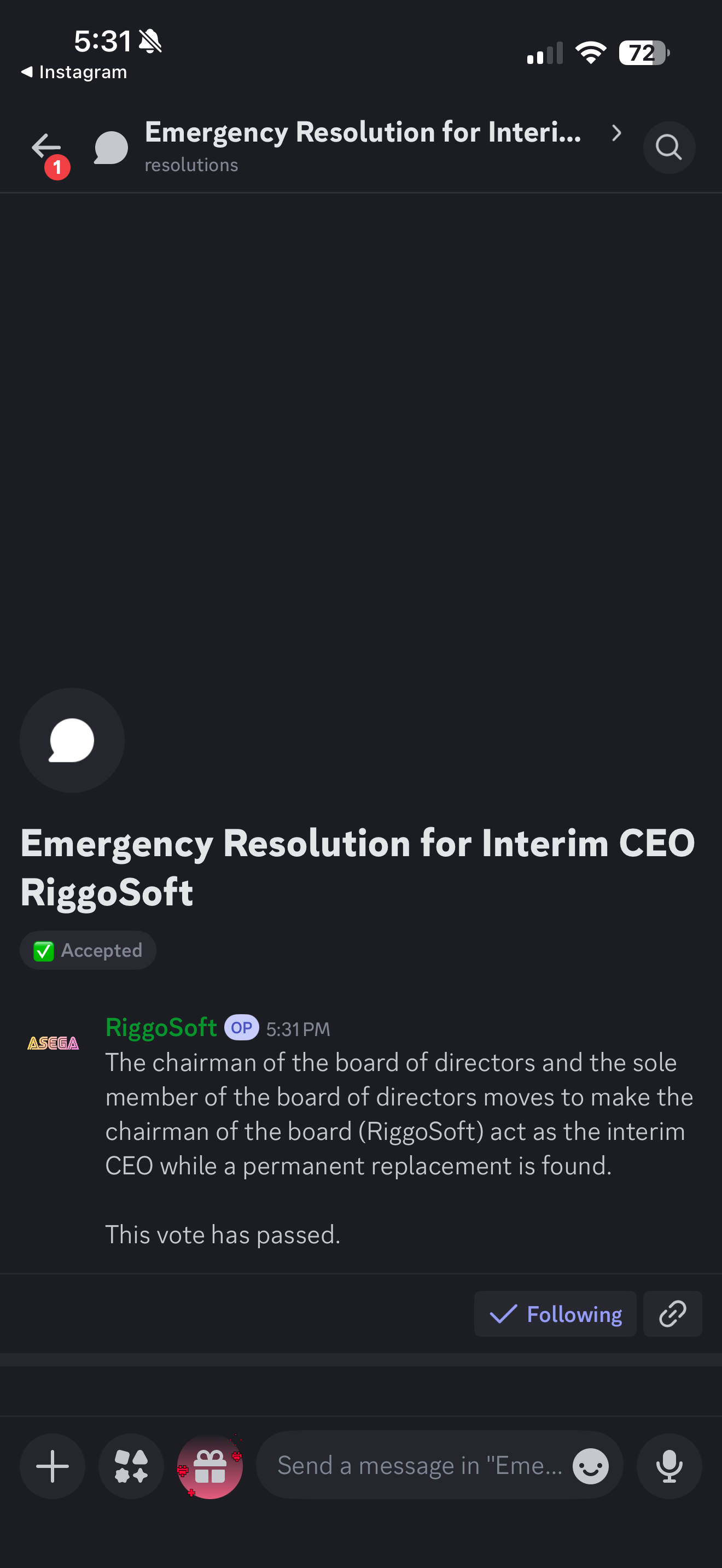 30. On 1/20/2026 at 11:52 AM RiggoSoft, acting on behalf of the board of directors of the plaintiff, posts a motion to remove the defendant from the position of Chief Executive Officer. As the sole director of the board of directors the motion passes and the defendant is removed from the position.