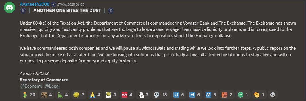 2. P-002: An announcement from the Secretary of Commerce, dated the 27th of June 2025, confirming the commandeering of The Exchange.