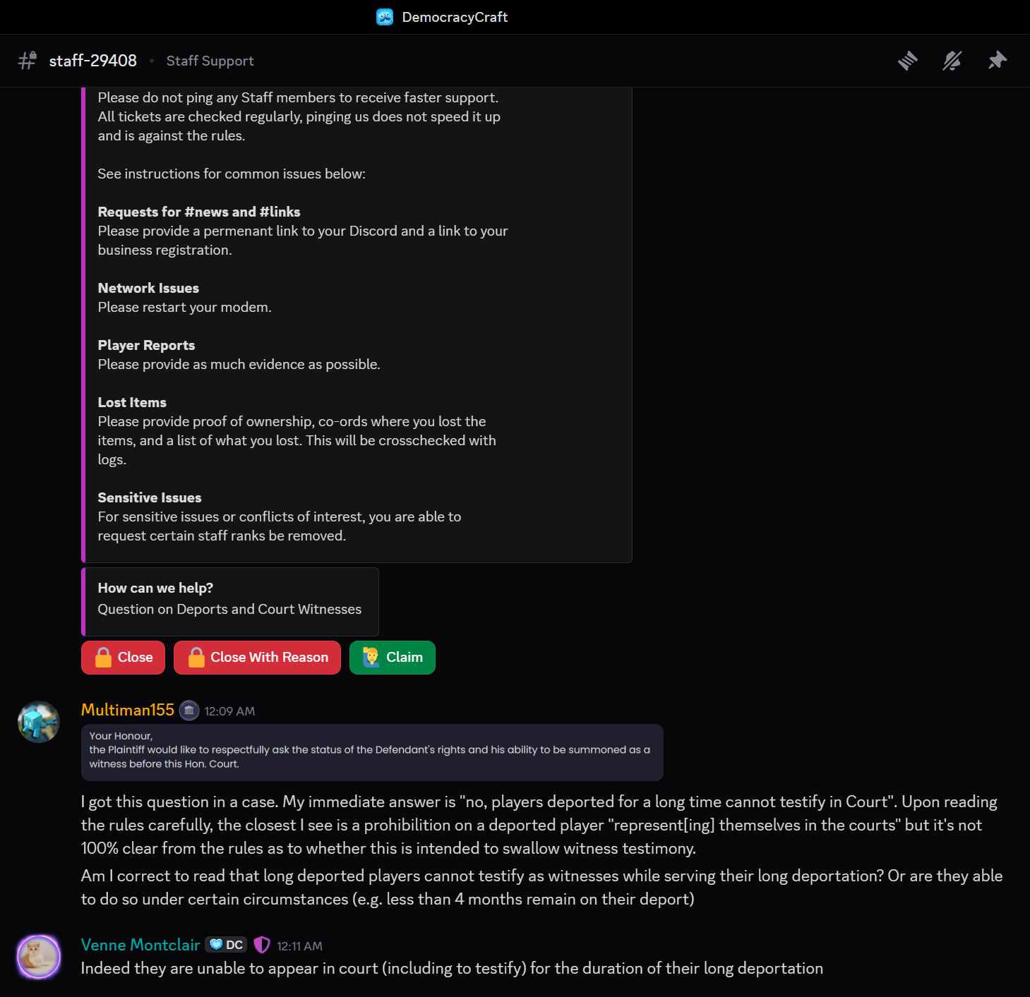 I cite Ligthiago v. FuriousPaladin where then Judge Matthew100x states ‘I will be writing the verdict shortly since according to staff, permanently banned players do not have a right to representation.’, gsse v. Commonwealth Judge Unseated Duke stated DC staff has been clear that deported players have no rights in Redmont.‘