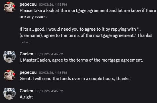 ZxRiptide entered into a binding contract between himself and MasterCaelen to provide consulting. In return, MasterCaelen paid $250,000 every fourteen (14) days. The Contract included a provision for a collateral, in which if MasterCaelen did not pay the agreed upon amount or was deported/banned, ZxRiptide would gain ownership over the collateral.